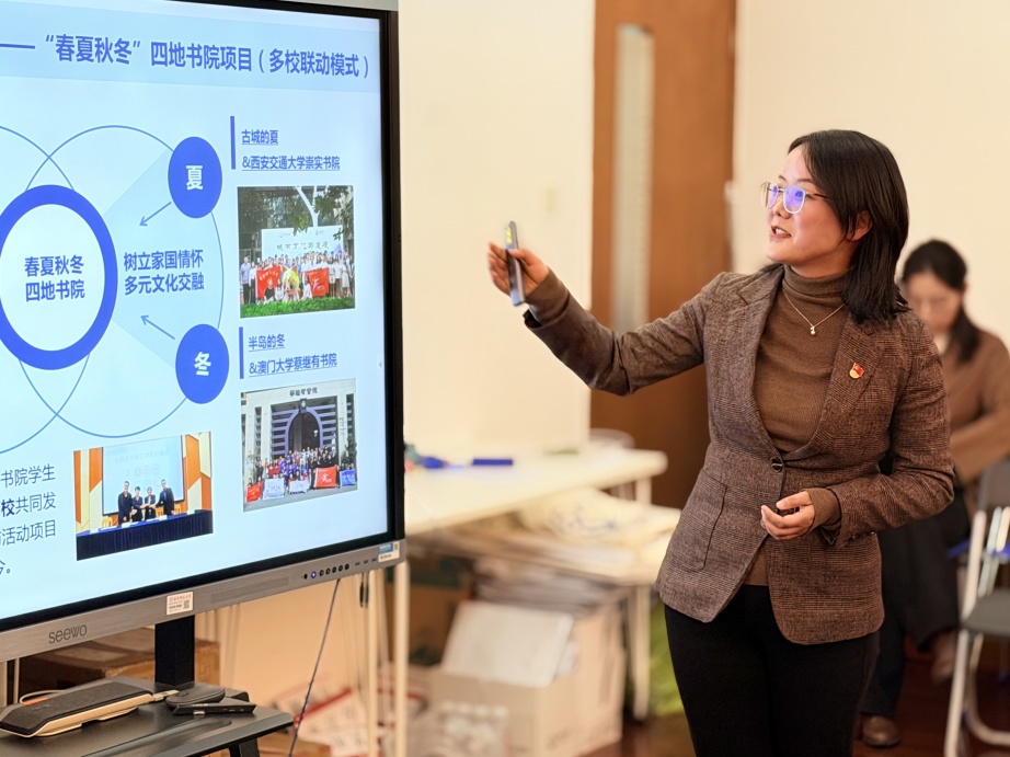 在专题学习环节,学生工作部主管成一川从笃学、善思、力行、致远四个维度介绍了全球胜任力培养的“OPEN模式”。孟宪承书院副院长杨亚星分享了孟宪承书院区域研学项目的实践思路、资源平台支持以及项目的收获和展望。公共管理学院党委副书记王婧结合课程设置、公益体验、参观访问推介了“公心治学,家国共融”教育部港澳国情教育研学营项目。校港澳台办公室主任王素斌系统介绍了学校港澳台学生国情教育的目标定位、工作体系和实践成效。国际合作与交流处主管孟雨则从历史视角切入,阐释了国际化人才所需具备的全球视野与本土认同,并介绍了新时代国际化人才的三力模型。